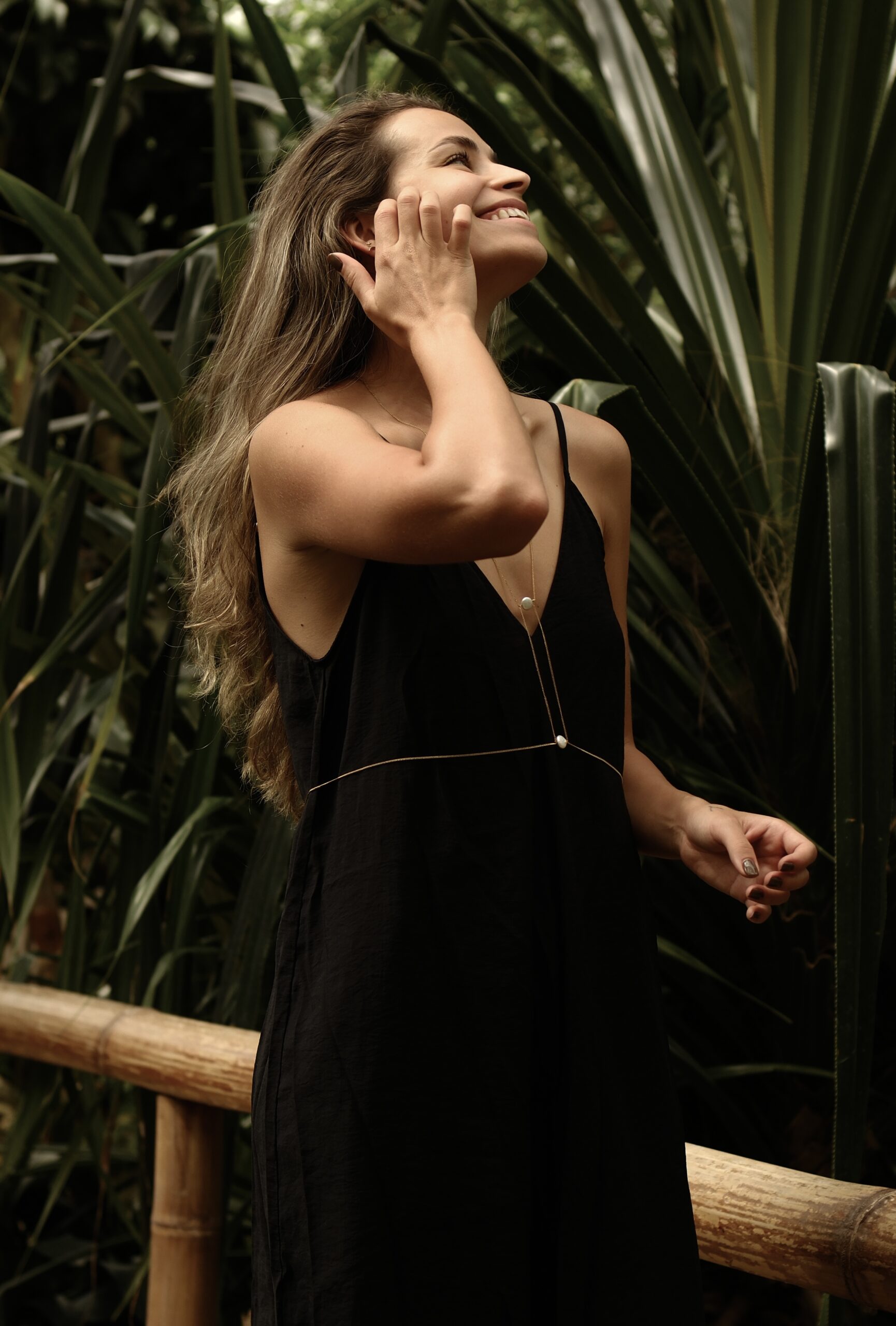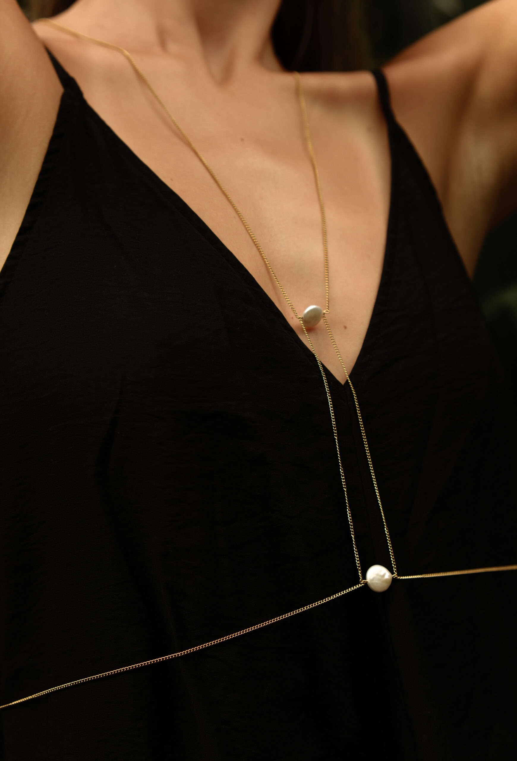 Jemný body chain s retiazkou a barokovými perlami – elegantný detail, ktorý vynikne na opálenej pokožke.