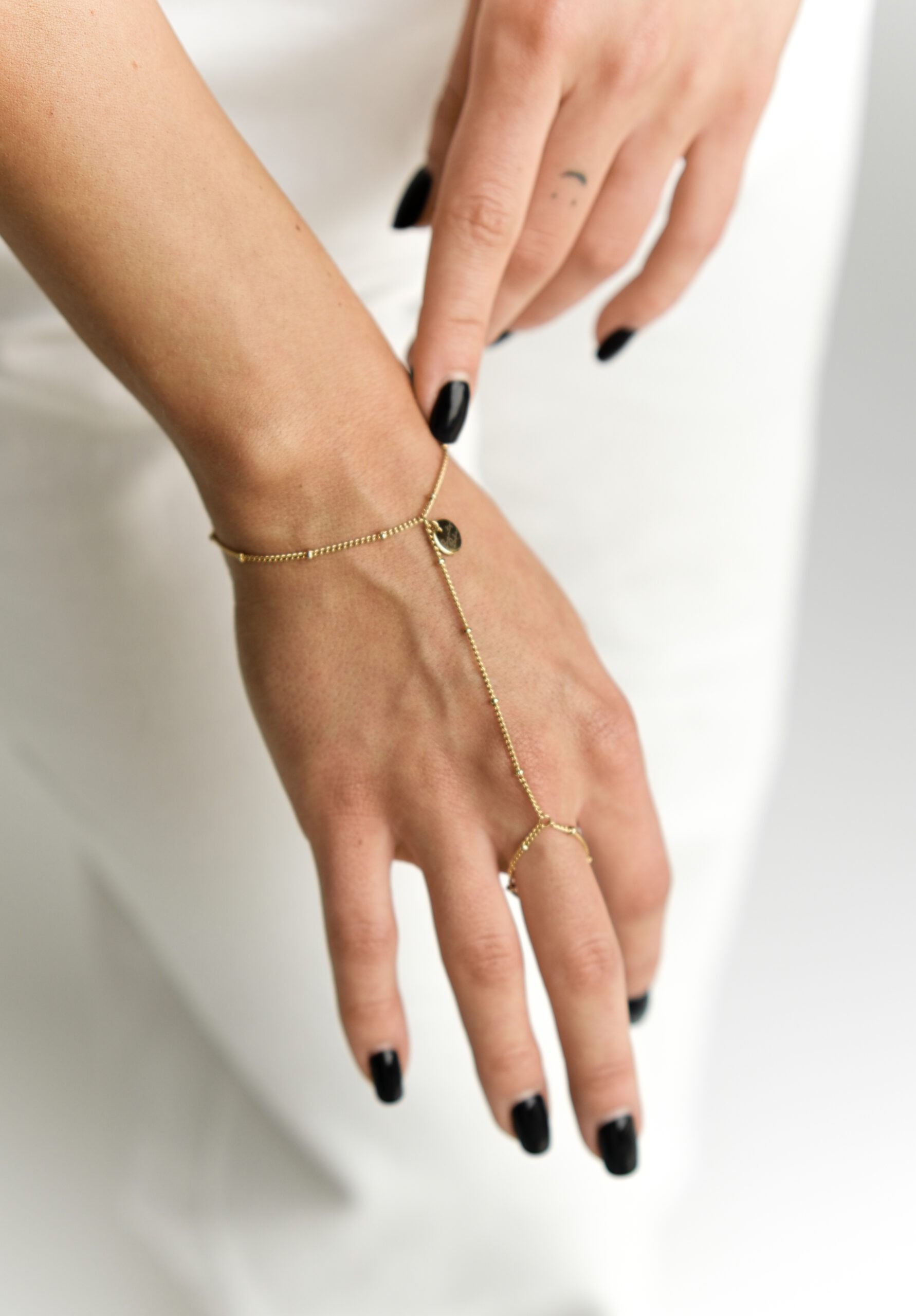 Minimalistická retiazka na ruku. Náramok spojený s prstienkom. Veľkosť prstienka je univerzálna.