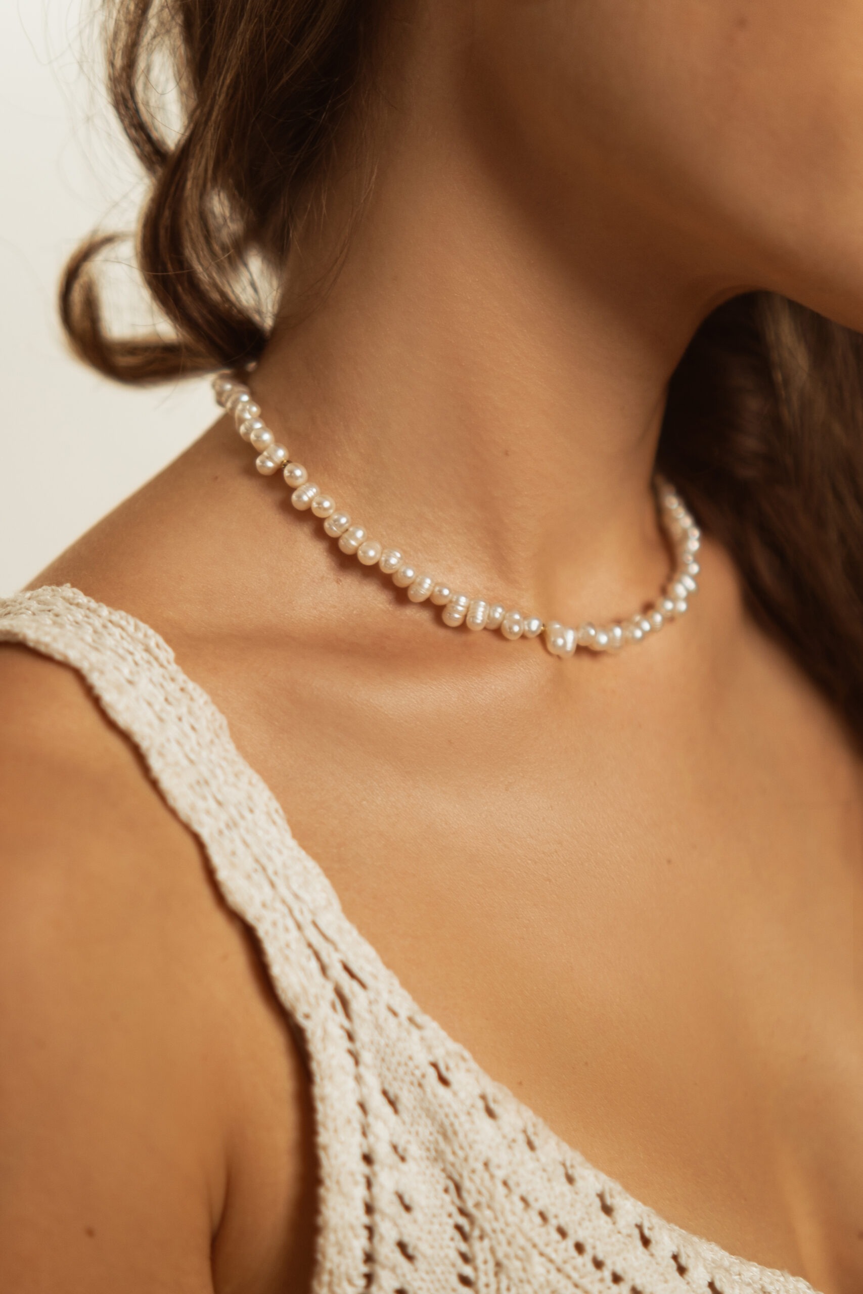 Minimalistický náhrdelník z „bubble“ nepravidelných riečnych perál. Štadartná dĺžka náhrdelníka je 38cm.
