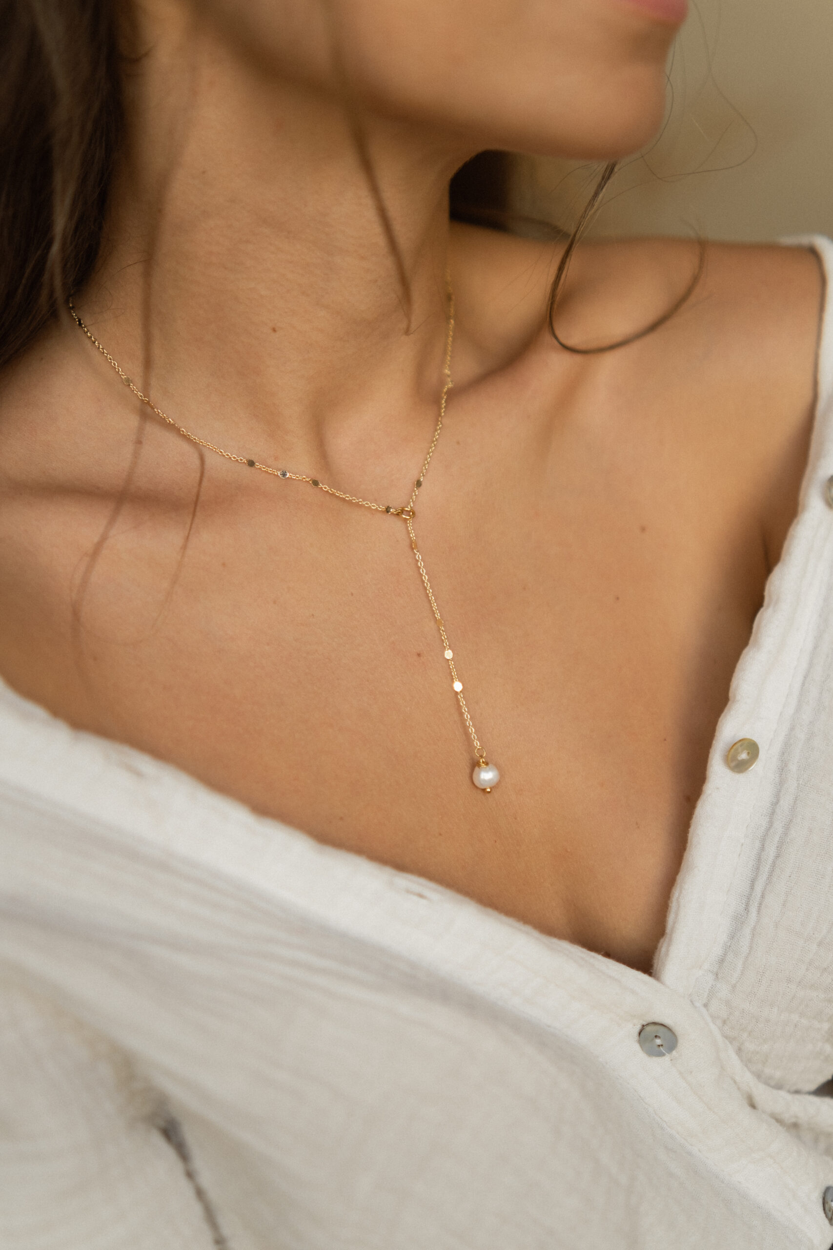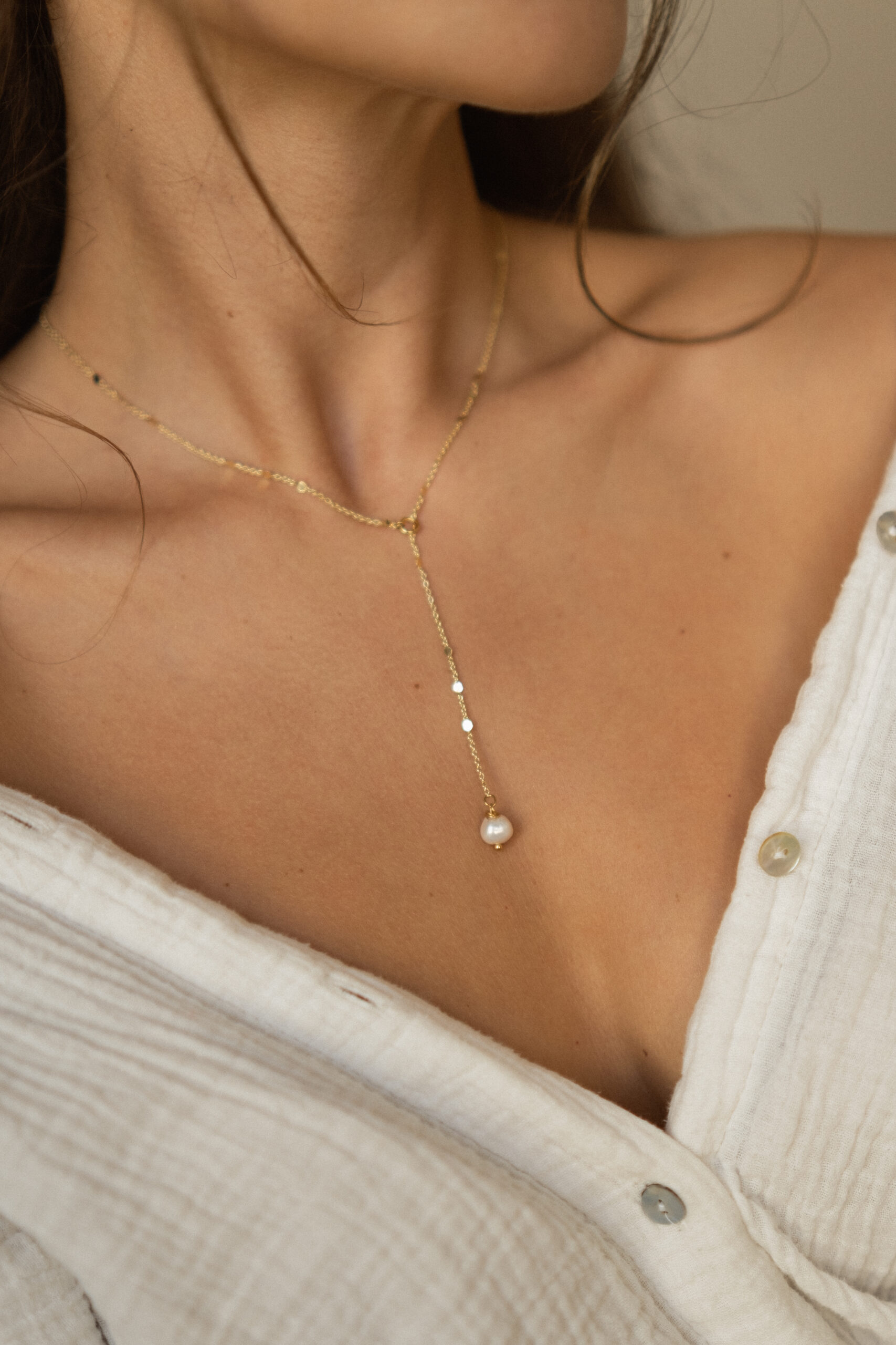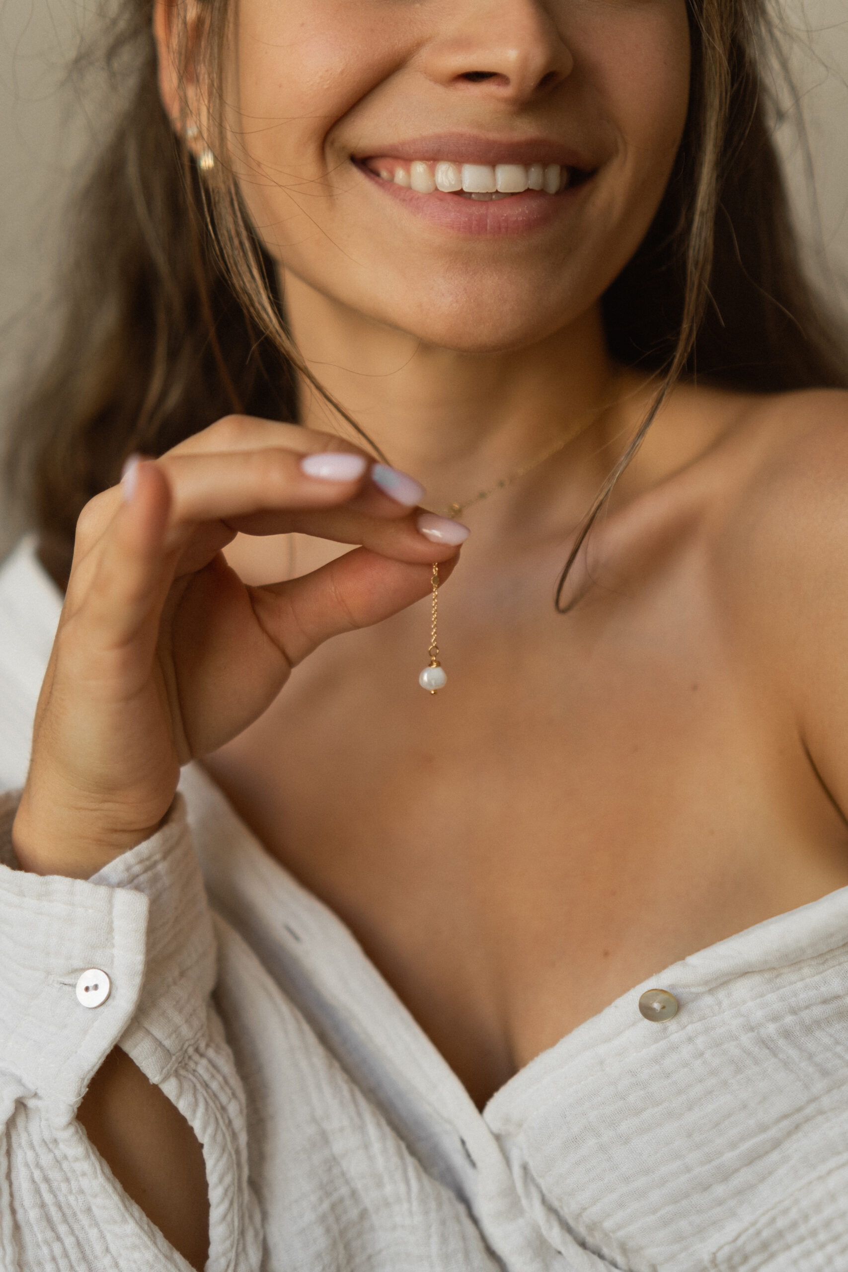 Minimalistický náhrdelník s riečnou perlou. Náhrdelník je na predĺženej pohyblivej retiazke. Dĺžka náhrdelníka je 38cm + 12cm predĺženie. (Ak si želáte inú dĺžku náhrdelníka, napíšte nám to prosím do poznámky pri objednávke).