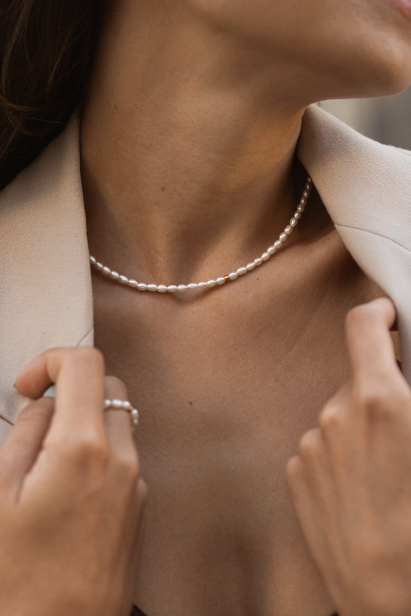 Minimalistický náhrdelník z mini riečnych perál. Štadartná dĺžka náhrdelníka je 38cm.