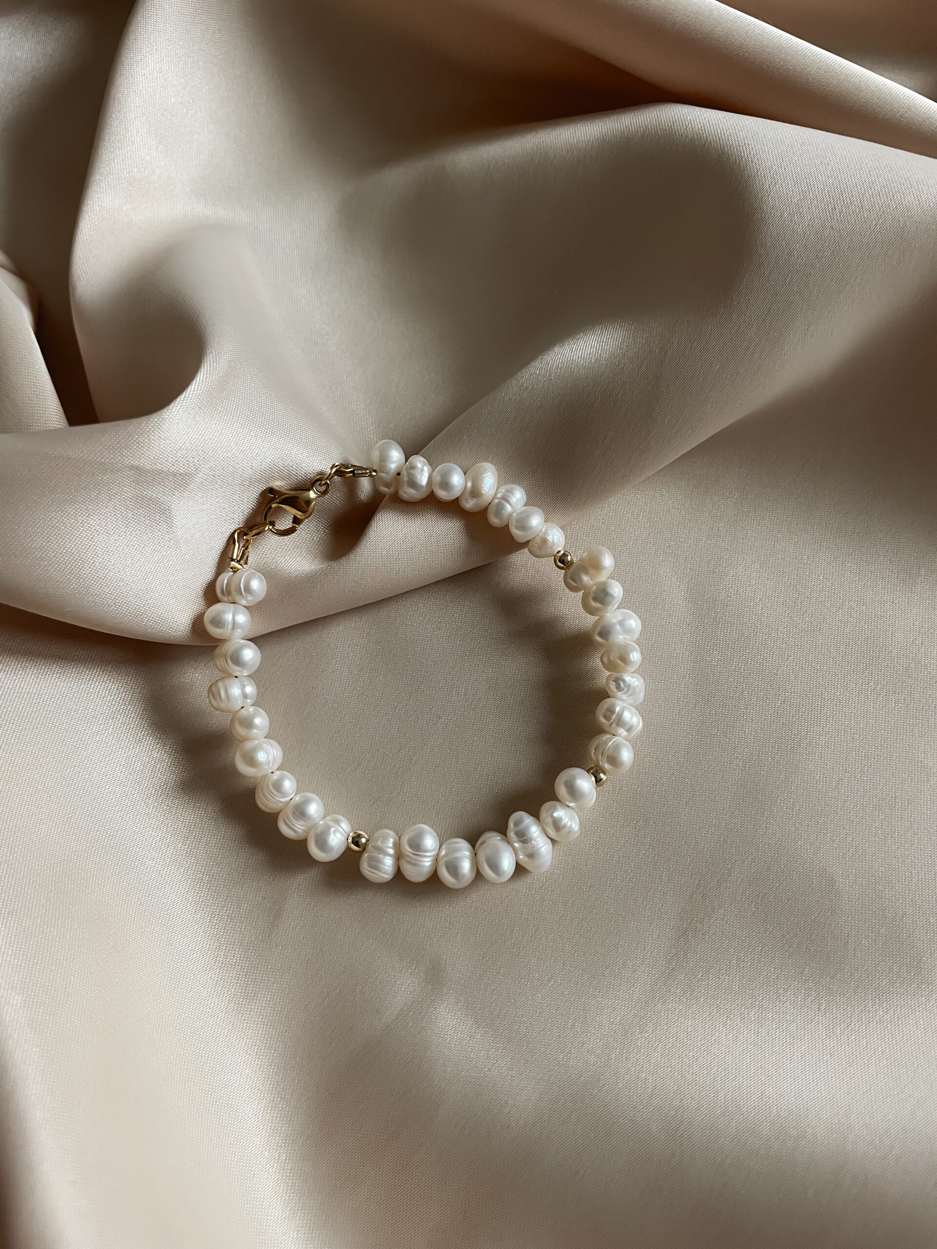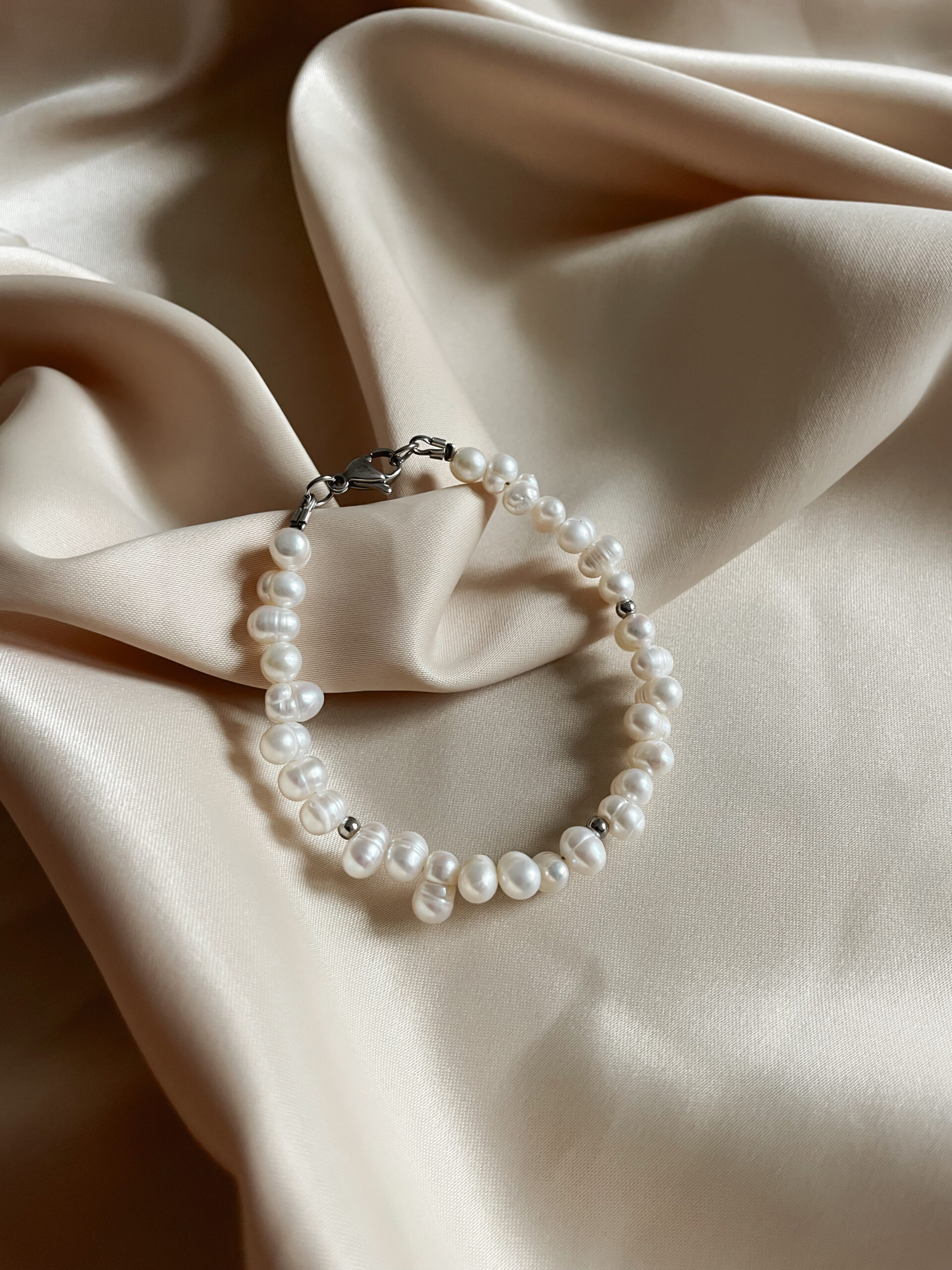 • Nepravidelné riečne perly: Každá z perál má svoj vlastný tvar a povrch, čo robí tento náramok nezameniteľným.