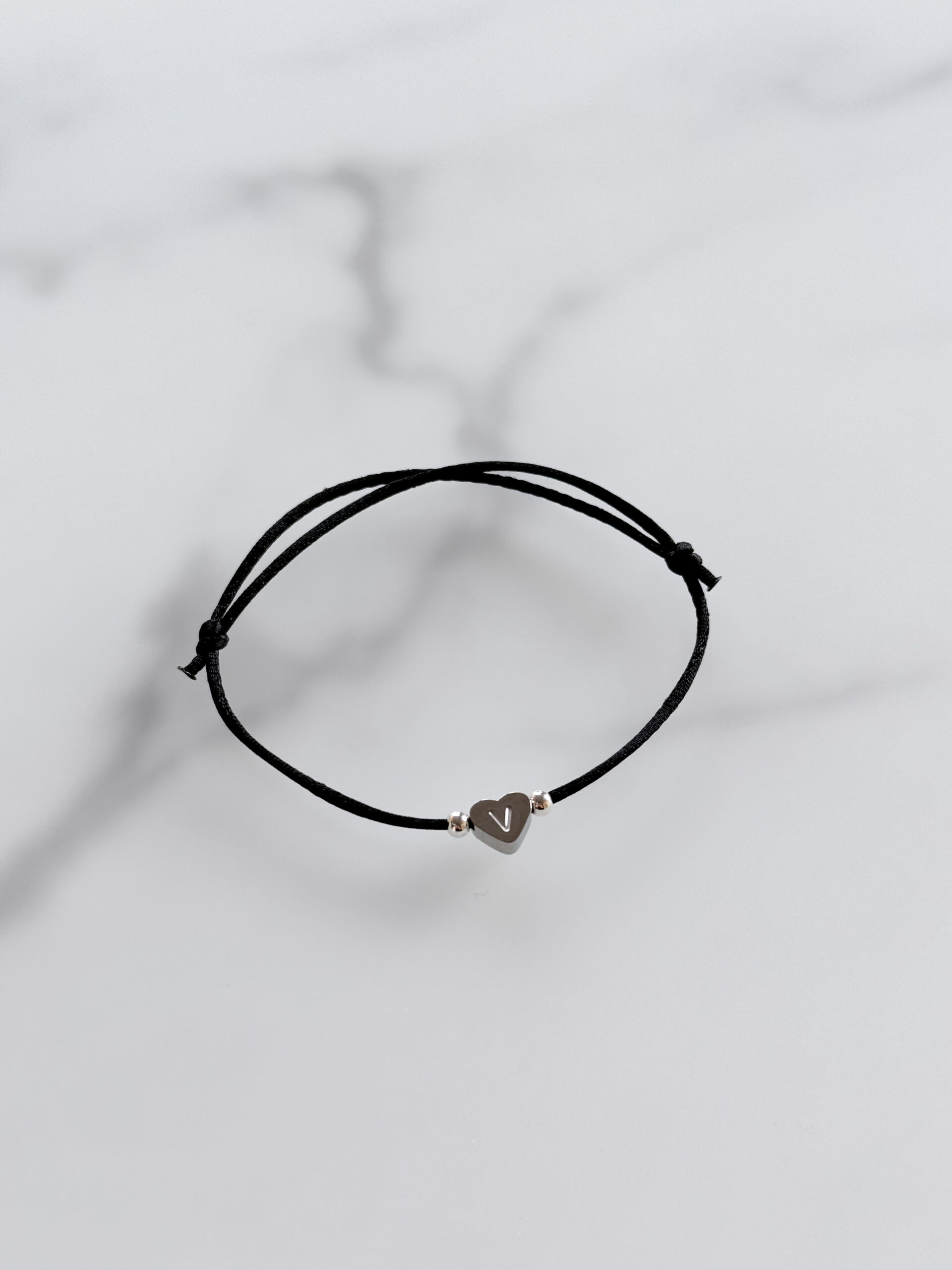 Minimalistický náramok na ruku s inicialkou. Veľkosť náramku je nastaviteľná cez posuvné uzlíky.