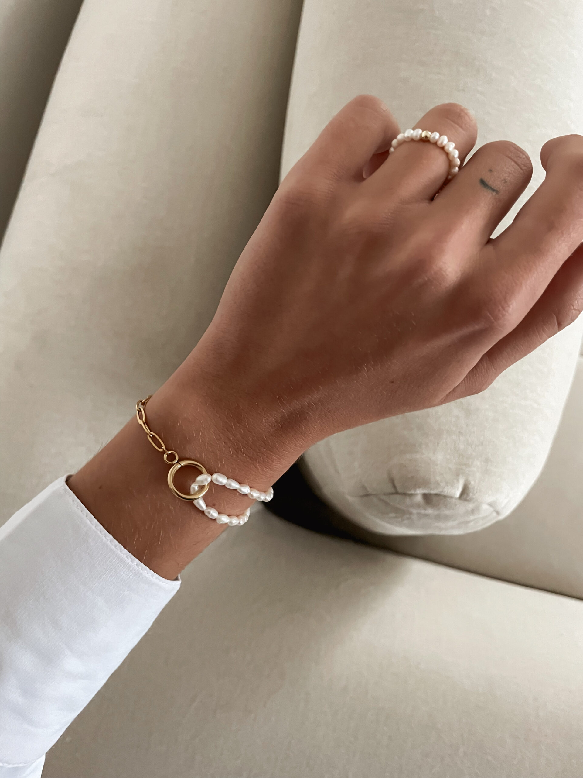 Náramok s riečnymi perlami a retiazkou z chirurgickej ocele je kombináciou prírodného pôvodu a moderného štýlu. Jeho kruhový dizajn symbolizuje jednotu a spojenie, čo ho robí vhodným ako darček pre niekoho špeciálneho alebo ako prejav vášho vlastného štýlu a vkusu.