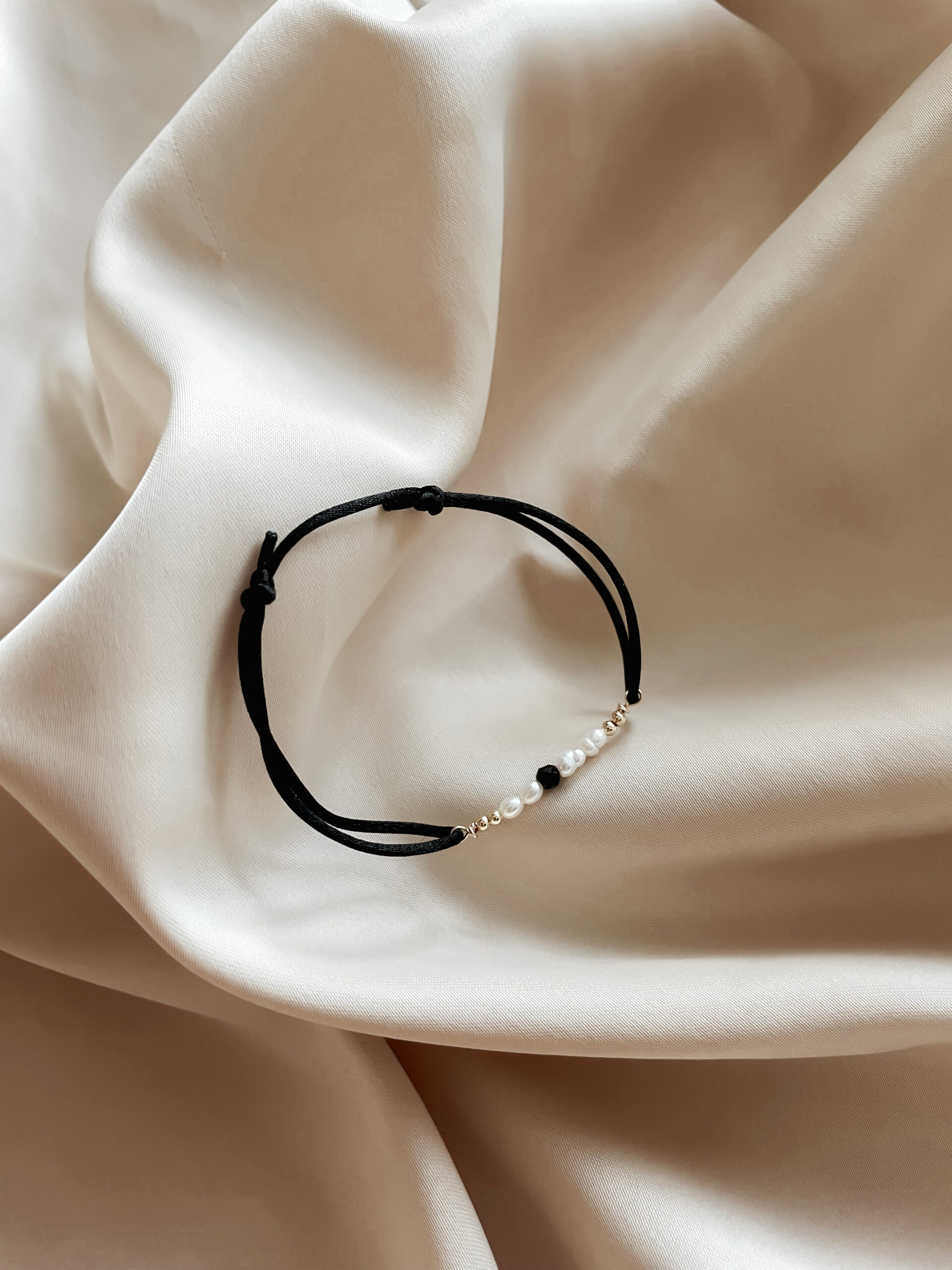 Minimalistický náramok na ruku na saténovej šnúrke s riečnymi perlami a onyxom. Veľkosť náramku je nastaviteľná na uzlíkoch.