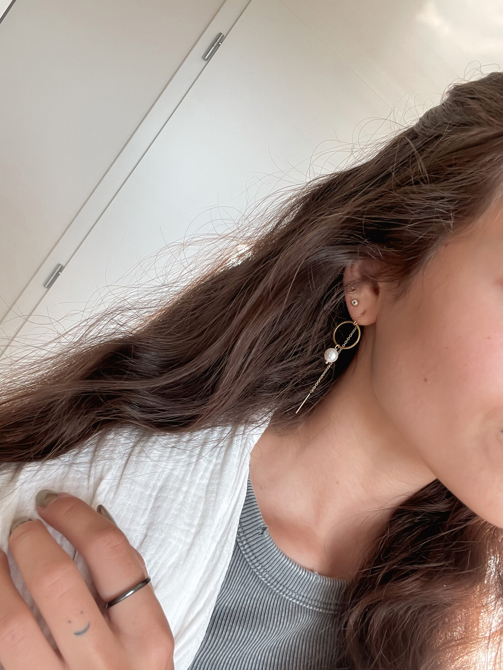 Minimalistické visiace dámske náušnice s riečnou perlou. Dostupné v zlatom aj v striebornom prevedení.
