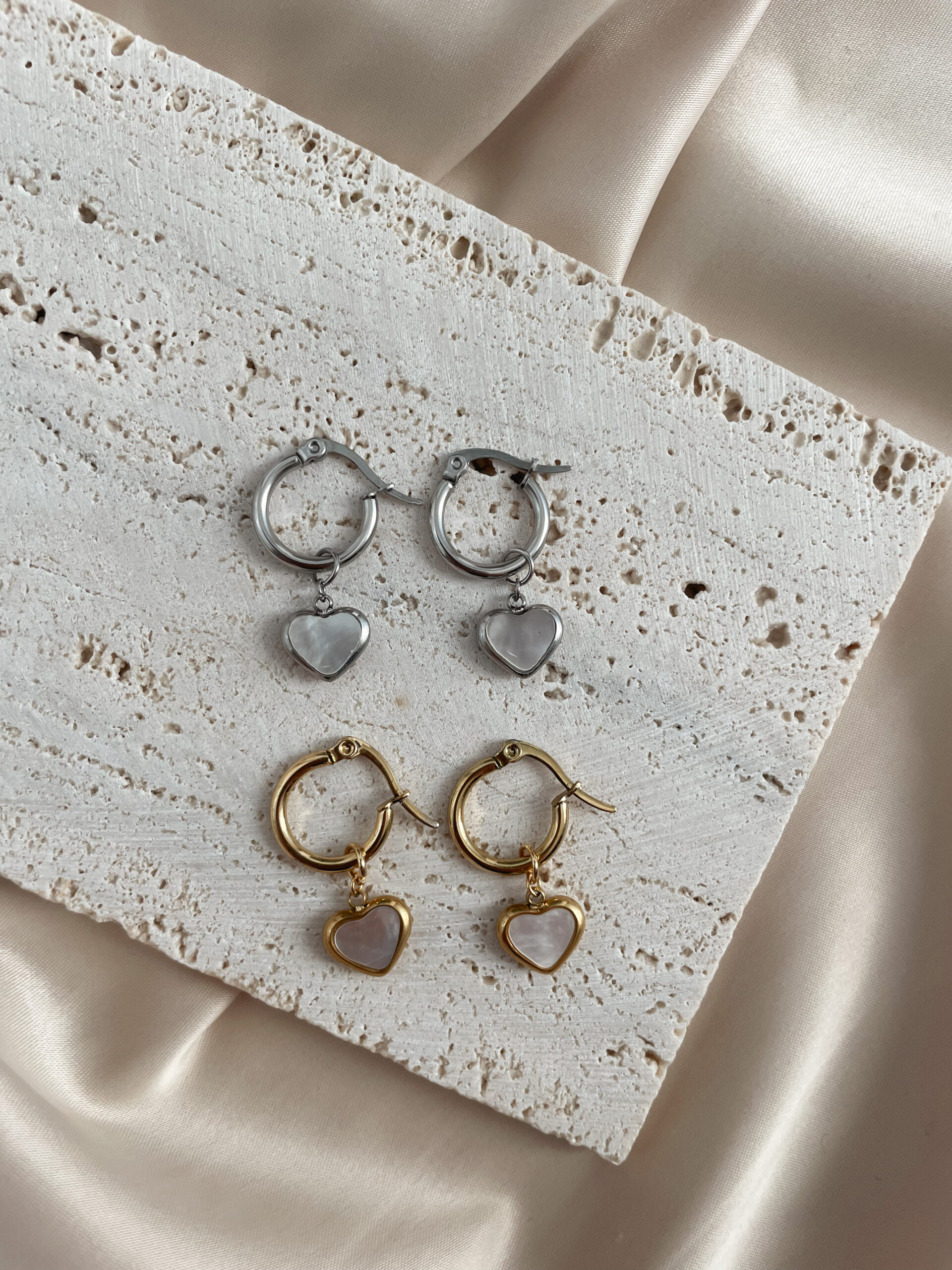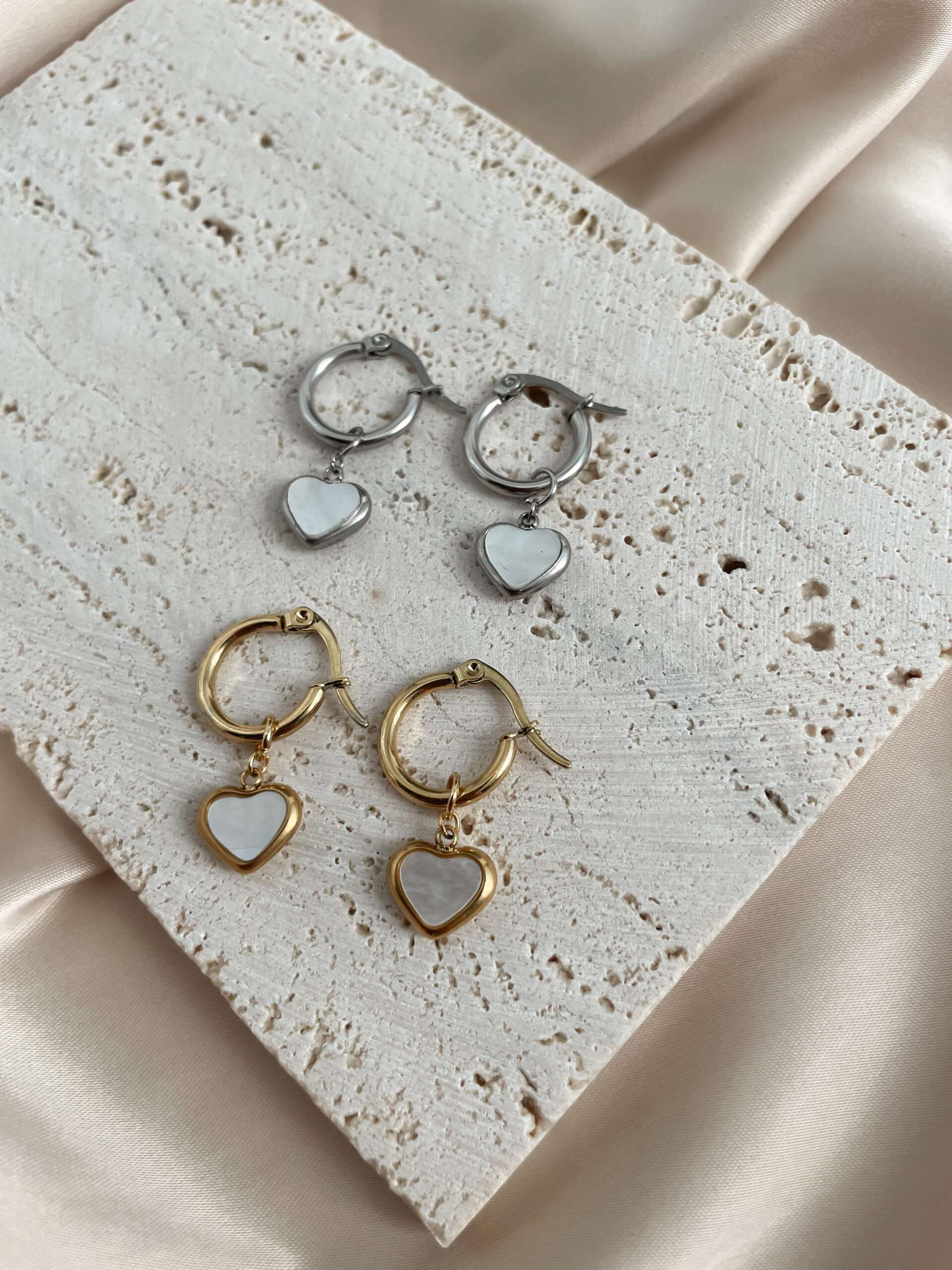 Minimalistické dámske náušnice so srdiečkami z perlete. Dostupné v zlatom aj v striebornom prevedení.