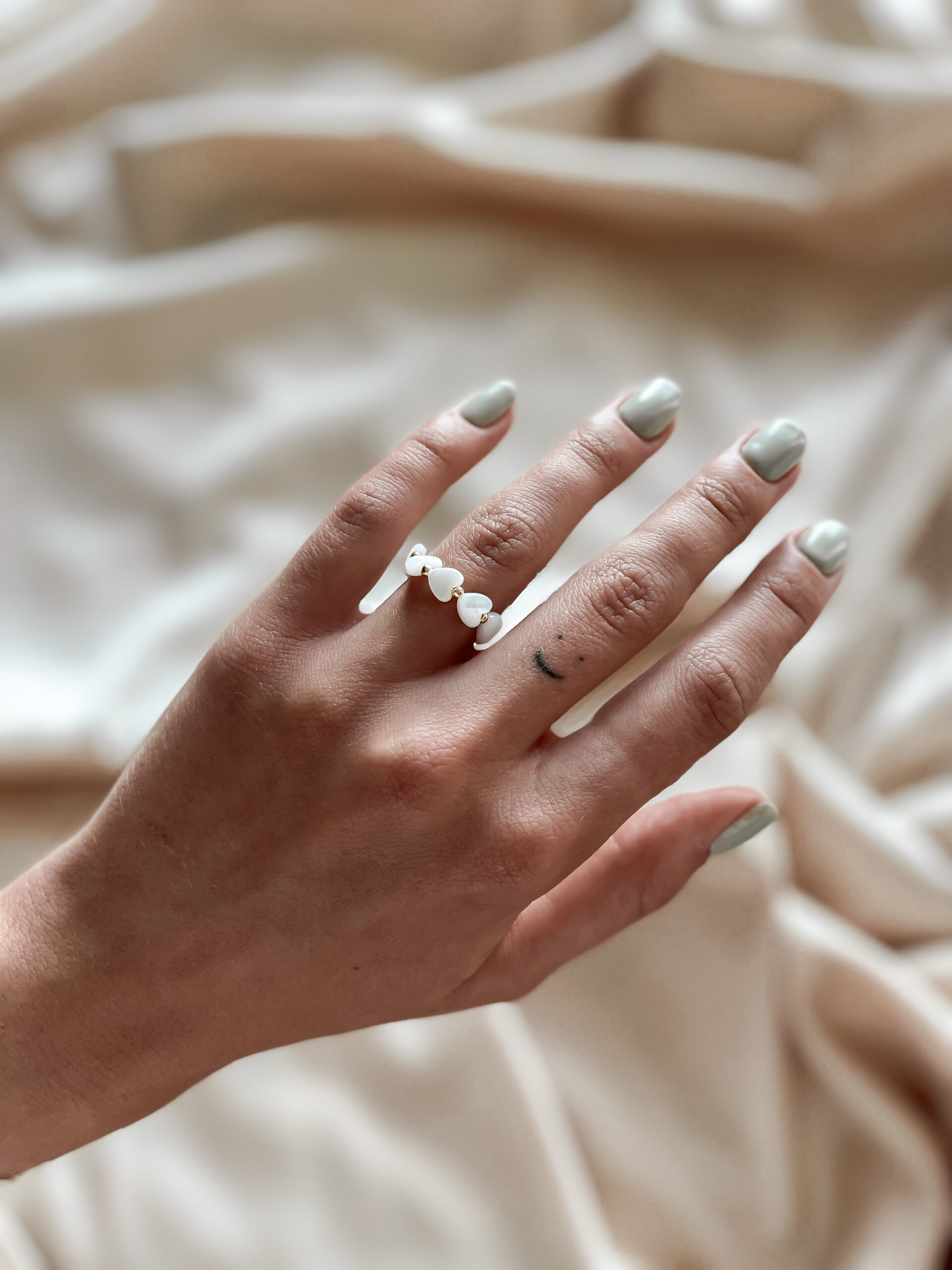 Minimalistický prsteň zo zlatých japonských korálikov a srdiečkom z perlete.